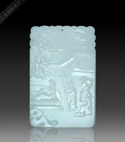 子刚制玉挂件,形若方形或长方形,宽厚敦实,犹如牌子,故简称为“子刚牌”。子刚牌的特殊魅力,体现在别开生面的形态上,精美的玉质上,精细的雕工于一体的艺术风范,领略到陆子刚玉雕的艺术风采。方形的子刚牌 ,非新疆和阗佳料不用,洁白无瑕,滋润温柔,花纹图案出类拔萃,以高超的琢玉技艺,多作剔地阳纹,以浅浮雕形式,将书画图纹表现得曲尽其美,淋漓尽致。常常一画琢山水、花鸟、人物、走兽图,虽用琢玉工具碾出,仍不失画家的笔墨情趣;另一面雕刻诗文,龙飞凤舞,仿佛是名书家直接书写在其上,并琢有子刚印款。将中国的书画艺术镌刻在玉牌的正反两面,加上玲珑剔透的牌头装饰,具较高的观赏性,玩味无穷,是子刚牌存在欢迎的主要因素。